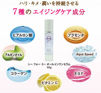 ①ヒアルロン酸 ②プラセンタ ③アルガンオイル ④コラーゲン ⑤Aqua Speed ⑥EGF ⑦ビタミンC