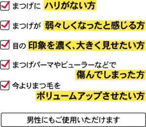 Widelash(ワイドラッシュ)配合:まつ毛の育成に最も重要な毛球ケラチノサイトの増殖を促進し、ハリやコシを与えるだけでなく艶やかな健やかなまつ毛に導きます。